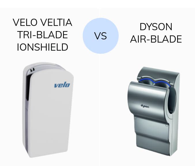The Dyson Airblade has a single air flow motor, while the Veltia Tri-Blade has a twin motor which delivers a faster and superior hand drying time.